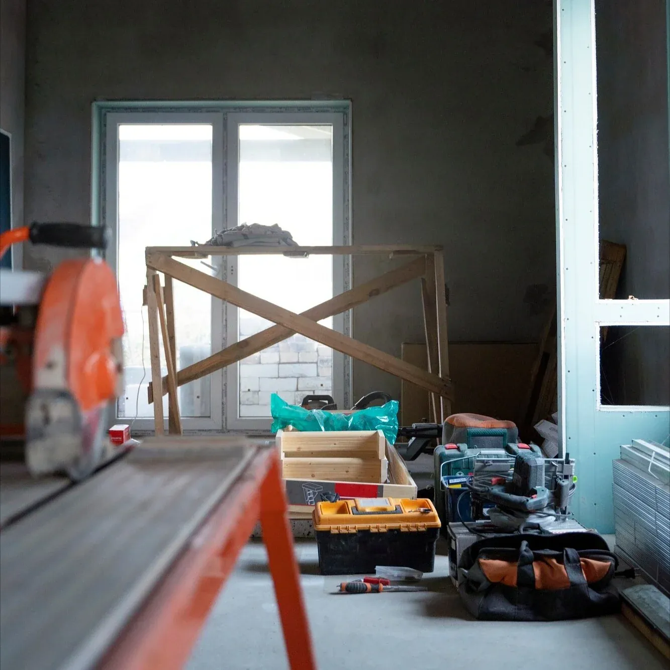 A construction site with tools and materials scattered across the floor of a partially completed room. A large double door is in the background, and various toolboxes and power tools are in the foreground.